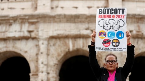 Een demonstrant houdt een plakkaat vast terwijl activisten buiten het Colosseum demonstreren en roept de G20-leiders op om de Olympische Winterspelen van Beijing 2022 te boycotten vanwege de behandeling door China van Tibet, Oeigoerse moslims en Hong Kong, een dag voordat de G20-top wordt gehouden in Rome, Italië. © REUTERS / Yara Nardi