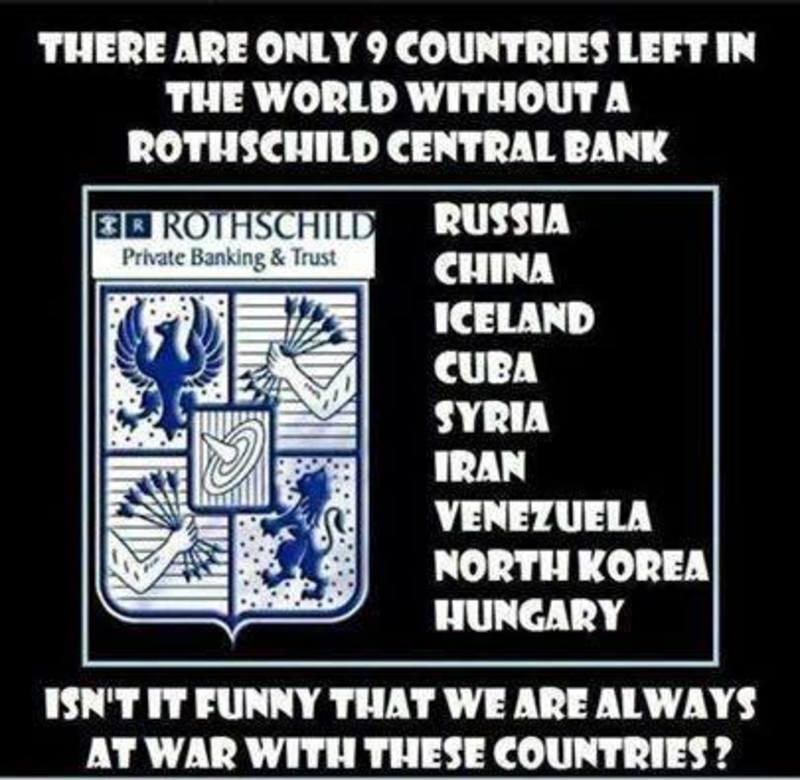 Op dit moment zijn er slechts 3 van de 195 landen zonder een Rothschild centrale bank, Noor Korea, Cuba en Iran.
