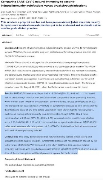 Zoals u kunt zien op deze post, hebben Israëli’s die het twee gedoseerde Pfizer BNT162b2-Gentherapie vaccinregime hebben gekregen en die niet eerder aan COVID-19 hadden geleden (d.w.z. SARS-CoV-2 negatief zijn) een veel grotere kans op een doorbraakinfectie met de Delta-variant??? dan degenen die eerder waren geïnfecteerd en niet waren Gentherapie gevaccineerd.