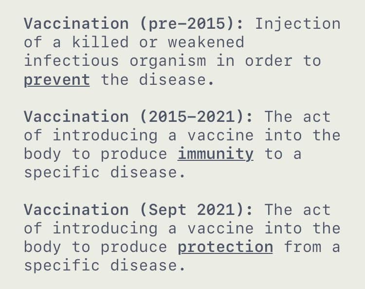 Hier is de nieuw geslagen door psychopaat Bill Gates omgekochte CDC-definitie van vaccinaties die op 1 september 2021 van kracht werd: