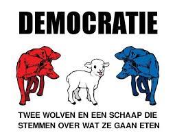 En o ja, wij mogen die ”machthebbers” zelf kiezen, maar zij zijn wel diegenen die dus de macht hebben, en niet het volk. Nochtans betekent ‘democratie’ (van het Griekse ‘demos’ (volk) en ‘kratein’ (heersen) wel degelijk dat het volk moet heersen, en nièt dat