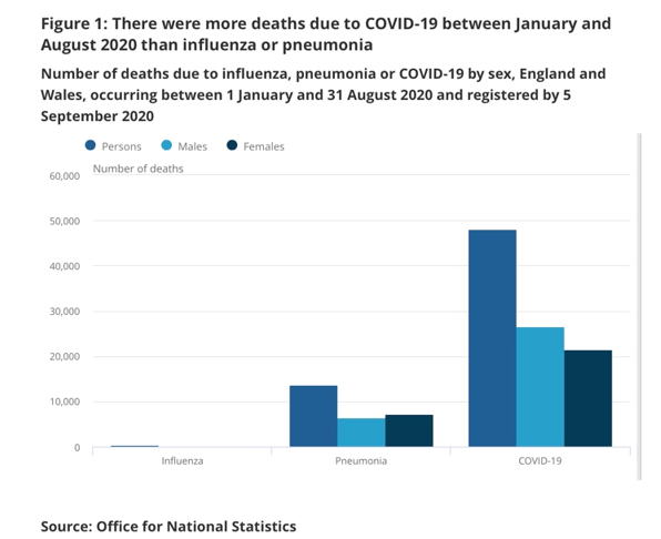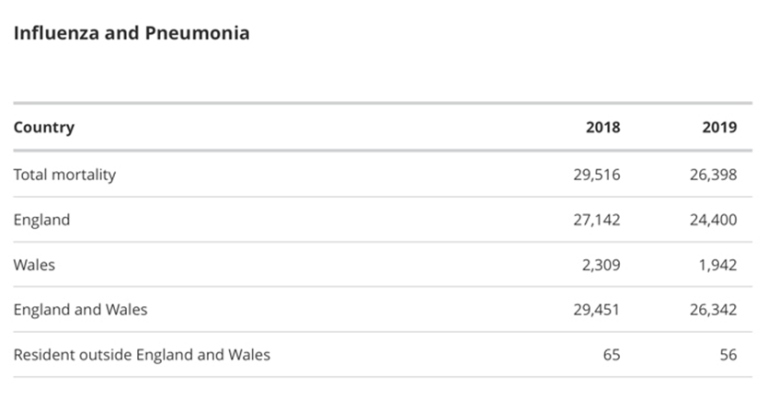 Sterfgevallen in 2020 voor influenza werden echter geregistreerd op slechts 394 en longontsteking op 13.619.