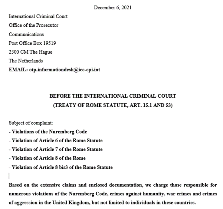 Op 6 december 2021 is een klacht ingediend bij de aanklager van het Internationaal Strafhof door een team uit het Verenigd Koninkrijk namens de mensen die misdaden beweren – gepleegd door Britse overheidsfunctionarissen en internationale wereldleiders van verschillende schendingen van de Code van Neurenberg, misdaden tegen de menselijkheid, oorlogsmisdaden en misdaden van agressie gepleegd tegen de volkeren van het Verenigd Koninkrijk.