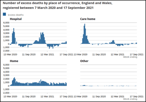 Gedurende alle voorgestelde “golven” van de “pandemie”, en gedurende alle tussenliggende perioden, is er een aanhoudende sterfteafwijking gebleven. ONS-statistieken hebben consequent verhoogde percentages van oversterfte in huis aangetoond . Aangezien er kennelijk geen pandemische ziekte is, moeten we ons afvragen wat de oorzaak is van deze overmatige sterfte.