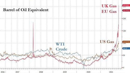 De Nederlandse en Britse aardgasfutures sprongen in slechts twee dagen met 60% omhoog en bereikten recordhoogten, samen met stijgende stroomprijzen. De Nederlandse aardgasfutures stegen vandaag met maar liefst 40% naar een record van 162.125 euro per megawattuur na een beweging van 20% op dinsdag. Britse aardgasfutures stegen vandaag met 39% tot 40 dollar.