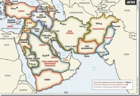 Hoe men in het Amerikaanse leger denkt over de buitenlandse politiek toont deze in juni 2006 in het Amerikaanse Armed Forces Journal verschenen kaart van het Midden-Oosten.