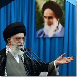 De Iraanse Opperste Leider Ayatollah Ali Hosseini Khamenei met een foto van Ruhollah Khomeini die in 1979 met westerse steun in Iran aan de macht werd gebracht.