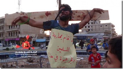ISIS in actie in de Syrische provinciehoofdplaats Rakka, hier met de kruisiging van een tegenstander. Het is de enige folterdood waar voor zover geweten de andere Syrische jihadisten tot heden geen gebruik van maakten.