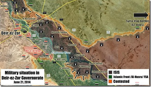De militaire situatie rond de provinciehoofdplaats Deir er-Zor. ISIS slaagde er recent in een bruggenhoofd uit te bouwen op de rechteroever van de Eufraat en bedreigt zo de positie van de andere jihadisten in die regio. Het deel van Deir er-Zor op de linkeroever dat in handen is van al Nusra en andere jihadisten staat eveneens onder druk van ISIS. Hun stadsdeel op de rechteroever dreigt dan weer in handen te vallen van het Syrische leger. Zie hiervoor naar de verschillende pijlen op de kaart.