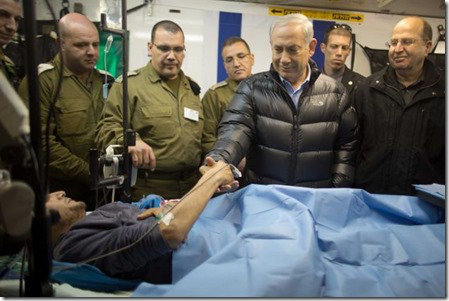 De Israëlische premier Benjamin Netanyahu op bezoek bij een Syrische jihadist die na gewond te zijn tijdens de gevechten in Syrië wordt opgeknapt in een Israëlisch legerhospitaal om daarna terug naar het front te gaan. Israël kijkt volgens de Israëlische pers ook niet naar de groep waartoe die jihadisten behoren. Dus ook jihadisten van Jabhat al Nusra die vlakbij de Israëlische grens vechten kunnen er voor een opknapbeurt (en ravitaillering?) terecht.