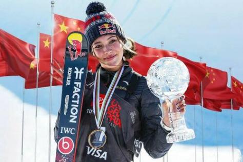 de in Amerika geboren freestyle skiester Eileen Gu met een medaille die ze won voor China op de Olympische Winterspelen van dit jaar.