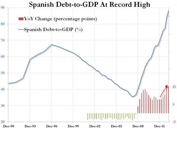 De Spaanse schuld steeg in het eerste kwartaal tot 88,2 procent van het bruto binnenlands product. Het was de snelste stijging op jaarbasis uit de Spaanse geschiedenis. Eind maart stond de Spaanse schuld net geen 20 procent hoger dan een jaar geleden. Tegen eind 2013 wordt een schuldengraad van iets meer dan 90 procent verwacht, al zal volgens de traditie dit cijfer nog opwaarts bijgesteld worden.