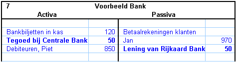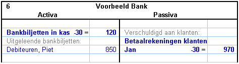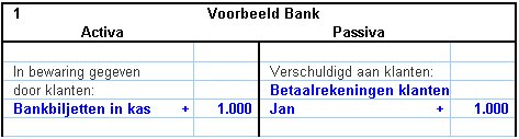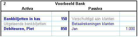 De bankier zegt “dank u wel” en schrijft de 1000 euro op de balans bij de bezittingen van de bank. Bankbiljetten in kas, + 1000 euro. Maar de bank zal het geld ook een keer terug moeten betalen.  De bank heeft dus ook een schuld aan Jan. De bankier schrijft bij de schulden van de bank: Betaalrekening Jan: + 1000 euro.