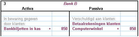 De bankier schrijft bij de schulden van de bank: Betaalrekening Computerwinkel: + 850 euro.