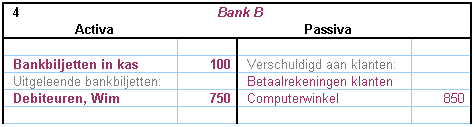 Piet koopt een laptop en de winkelier brengt de 850 euro naar zijn bank, Bank B. De bankier zegt “dank u wel” en schrijft de 850 euro op de balans bij de bezittingen van de bank. Bankbiljetten in kas, + 850 euro. Maar de bank zal het geld ook een keer terug moeten betalen. De bank heeft dus ook een schuld aan de winkelier.