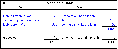 Bij een bank noemen ze dat activa. Aan de rechter kant, de credit kant, staat wat de bank verschuldigd is aan anderen. Dat zijn de passiva. Aan deze kant vind je ook wat verschuldigd is aan de eigenaren van de bank, het Eigen vermogen, ook wel Kapitaal genoemd. Wanneer je van alle bezittingen alle schulden aftrekt, dan hou je het Eigen Vermogen over. (Bij een bank zijn de getallen zo groot, dat op de balans de laatste drie cijfers meestal worden weggelaten. Je moet dan alle getallen met 1000 vermenigvuldigen.)