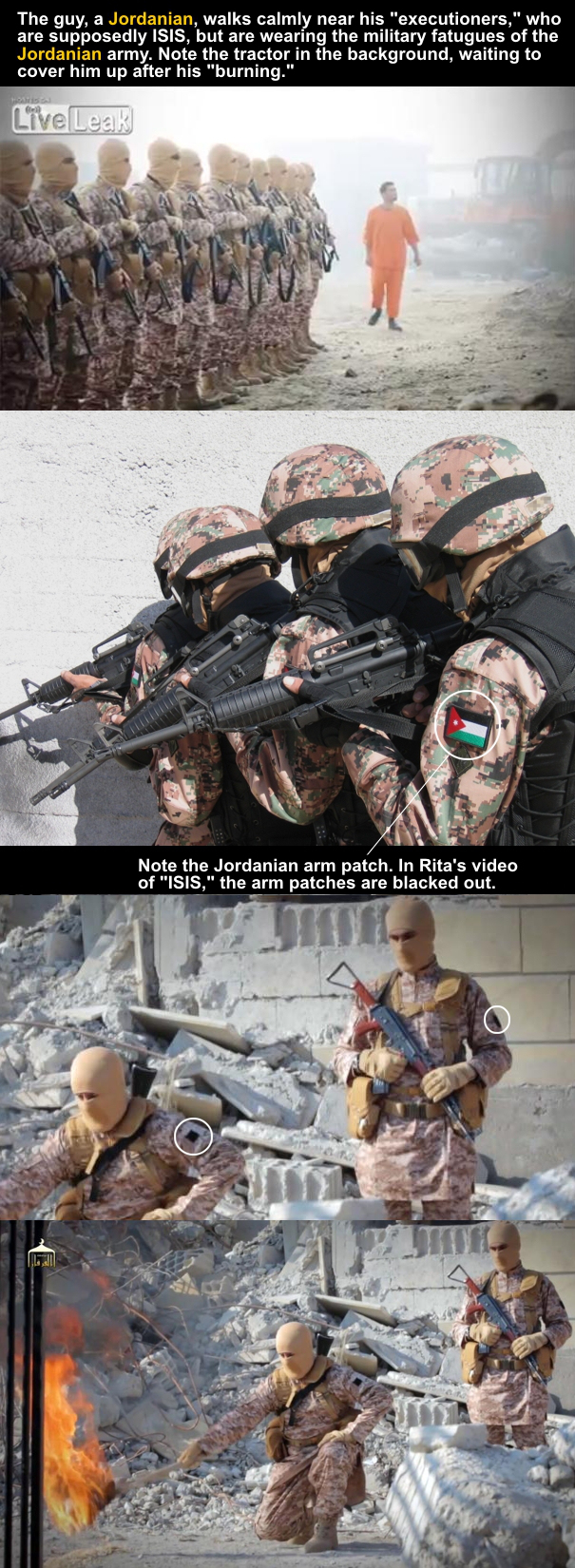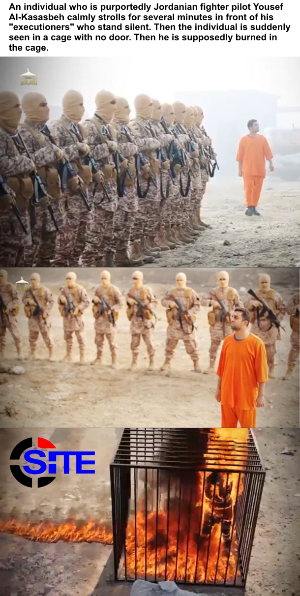 Maar in plaats van “onthoofding,” had Rita dit keer, voor de verandering ISIS (d.w.z. Jordaanse leger jongens die zich voordeden als ISIS) Al-Kasasbeh levend in een kooi laten verbranden op 3 Jan 2015, of misschien was het 3 februari 2015. (Verschillende media geven verschillende data).