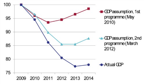 Terwijl de reddingsplannen er aanvankelijk nog van uitgingen dat de de economie zich relatief snel zou herstellen, donderde deze in feite gewoon, zoals elke econoom zou begrijpen, de ravijn in. Hetgeen Griekenland meemaakte, kan de vergelijking met de Grote Depressie van de jaren ’30 gerust doorstaan.